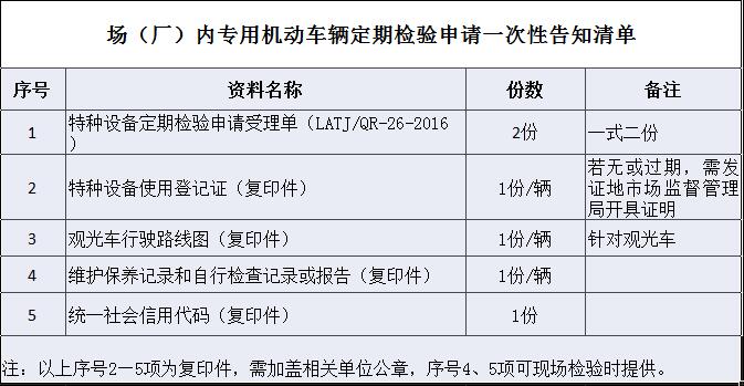 场(厂)内专用机动车辆定期检验申请一次性告知清单